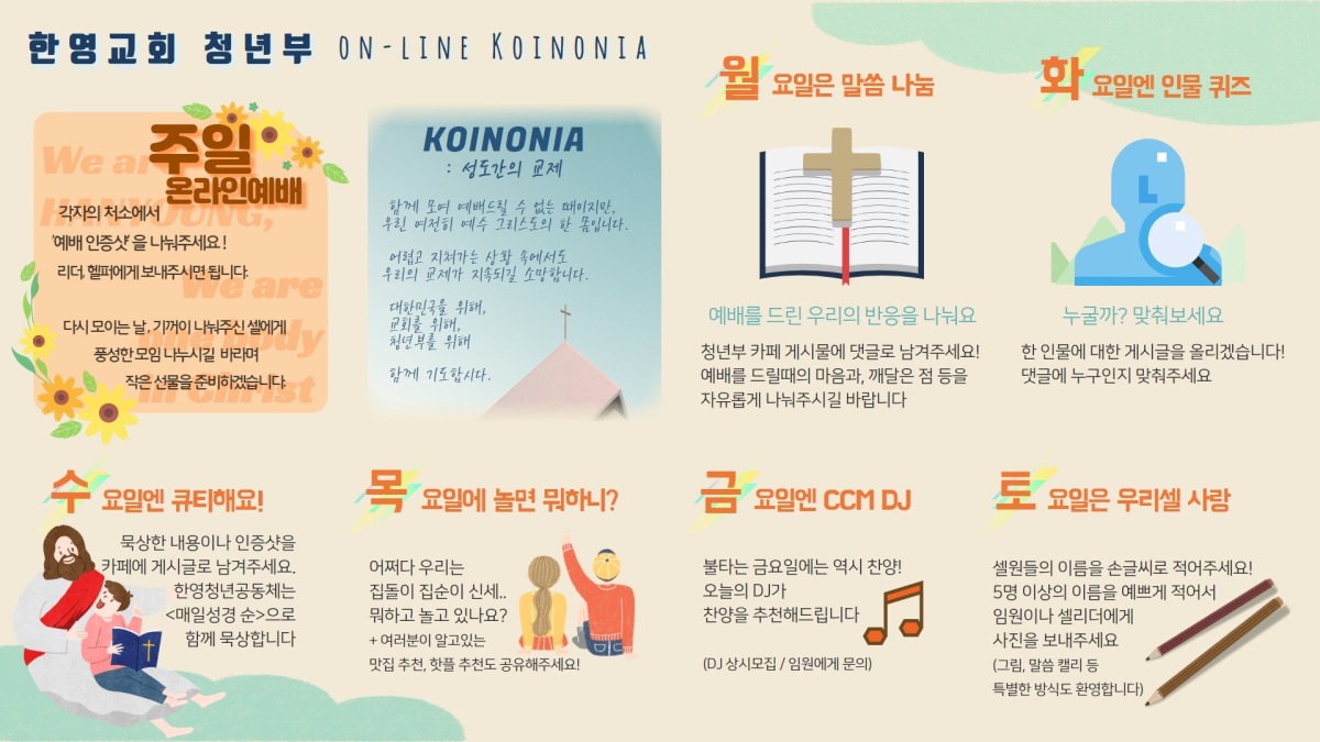 | 115 | [ 신앙 싹3 / 말씀?기도?찬양 온라인모임 ] - 한여름 한영청년부 소식 | 최시온 | 2020-07-01 | 558 | |